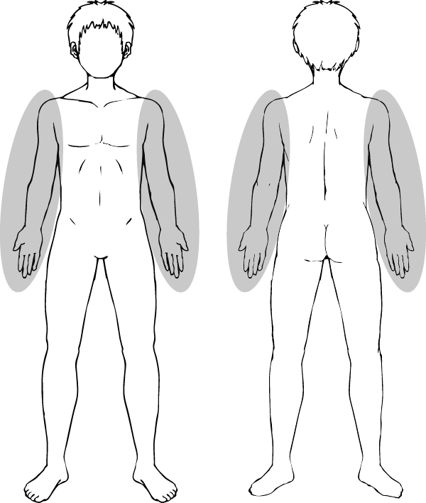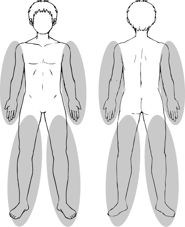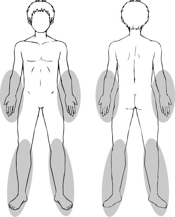 両ひじ下~指先まで、両ひざ下~足先まで。