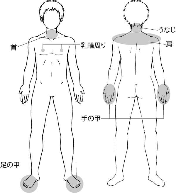 首・うなじ・乳輪周り・肩・手の甲(指含む)・足の甲(指含む)の中から1つ